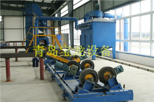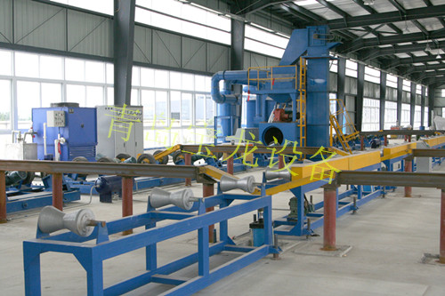 钢管外除锈作业线本系列是大、中、小型管径钢管、铸管及圆柱体抛丸清理设备,钢管外除锈作业线利用y效抛丸器抛出的高速弹丸打击钢管、铸管表面,使之获得金属原色。提高工作表面的抗拉和抗压强度,使其具有一定的粗糙度,达到防腐、护管、延长钢管使用寿命的目的。